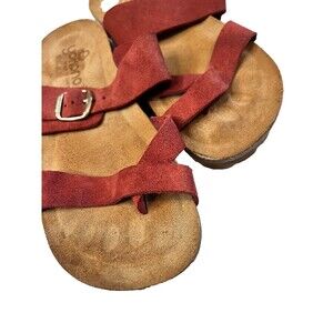 Yokono Stappy Suede Sandal Cayenne, suede upper with one buckle ajustable strap, toe loop strap, suede sock liner that has toe indication detail, latex & cork mid sole & rubber sole. soles are unmared, never worn. Like new condition.