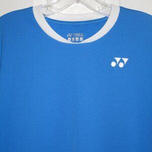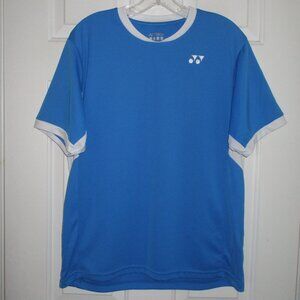 Yonex Mens S/S Blue Crewneck Tennis Shirt. Size Small. Armpit-to-armpit 21.5", Length 27". 100% Polyester in Blue/White. Previously owned but lightly used, zero sign of wear, stain or defect.