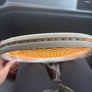 My son bought brand new from a local tennis shop used a few times. Excellent no flaws to note gold tan tones new strings put on at time of purchase Nov 2024