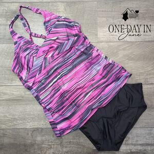 A most charming tankini that artfully crosses at the bodice, creating a silhouette both flattering and refined for the discerning lady's aquatic pursuits. The delightful pink and black coloring presents a spirited yet elegant appearance, while the thoughtful construction ensures comfort during one's seaside diversions. This delightful piece arrives in pristine condition, never having graced the waters, and promises to be a most agreeable companion for summer's pleasures.
