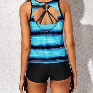 Backless Tankini: The modest tankini top features an open-back design, perfectly showcasing the strappy criss-cross straps and O-ring detail. A slight overlap at the top of the back enhances the flattering appeal of this three-piece swimwear.