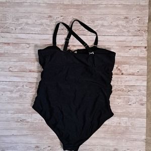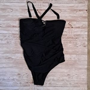 Black one piece swimsuit with v neck, ruched tummy control, criss cross back, cutout, adjustable shoulder straps.