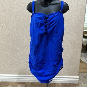Design: Royal Blue one piece swimsuit with v neck, ruched tummy control, criss cross back, cutout, adjustable shoulder straps.