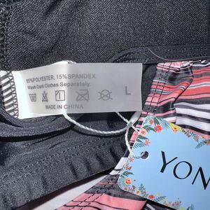 This Yonique women's swim top is a stylish tankini in a pink and black striped pattern, featuring a racerback strap design and layered accents. The top is size L and made of polyester and spandex, with built-in padded bra for added support. It is machine washable and offers slimming effects, stretch, and a classic beach theme. This top is perfect for beach outings or pool days, providing both style and comfort for women looking for a flattering swimwear option.