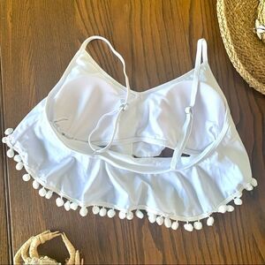 Adorable white top with Pom Poms, draped front, adjustable straps, removable padding, size M. Bottom sexy midrise bottoms in tropical print.