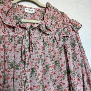 • Y-orange Sheer Ruffle Blouse Small Med Floral Romantic Cottage Peasant Prairie