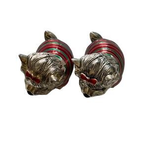 The product is a set of two silver metal salt and pepper shakers in the shape of Yorkshire Terrier dogs, dressed in green and red enamel sweaters. The shakers are branded by Neiman Marcus and are an original holiday-themed design. Perfect for collectors or anyone looking for unique kitchen tools, these shakers add a touch of charm and fun to the dining table or collection.