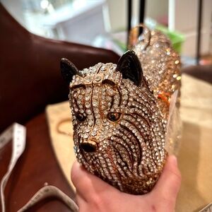 Gold Yorkie Dog Minaudiere: Austrian Crystal Hard Shell Clutch handbag. New, still has original bag with extra crystals. Gold Yorkshire Terrier Yorkie Dog Minaudière: Handmade with Swarovski Austrian Crystals, Hard Shell Clutch, with chain, magnetic closure. Sparkles! 6 by 6inches. Paid $185- plus tax and shipping from Etsy. Wish I could keep this Yorkie Terror in a basket, remind me of Toto from Wizard of Oz! it but EVERYTHING MUST GO!
