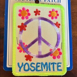 Colorful Yosemite souvenir patch featuring a peace sign and floral design. Bright and vibrant.