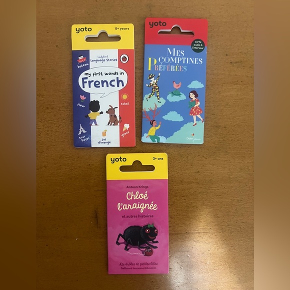 Set of three Yoto language learning cards. Includes French language cards with colorful designs.