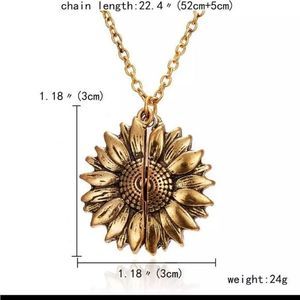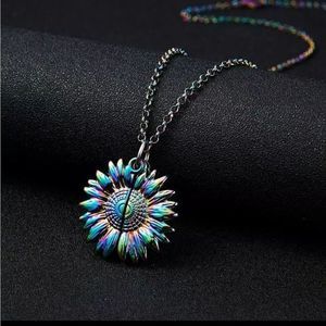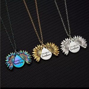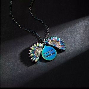 A sunflower shaped open locket with, you are my Sunshine, in the inside. Locket does not lock shut. Zinc alloy. Available in 3 colors. Approx 22 inch chain.