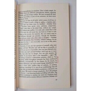 by J. Krishnamurti, published by Harper & Row in 1972. A foundational work of spiritual philosophy and self-inquiry exploring freedom, awareness, and transformation. This copy shows heavy cover and spine wear, age-related page toning, and handwritten notes/markings inside. Binding remains intact and fully readable. Ideal as a readers copy for students of Krishnamurti rather than a collector-grade example. Please review photos for exact condition.