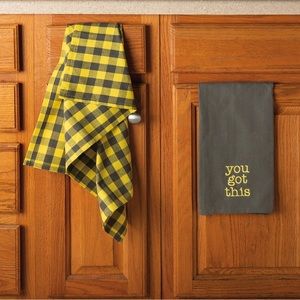 A set of two coordinating cotton kitchen towels. Towel one features embroidered "You Got This" sentiment in yellow on a gray base. Towel two features all-over gray and yellow buffalo check design. Towels are neatly packaged together on a cardboard hanger with a hole to easily display on rack. Machine-washable.