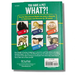 RourkeYou Have a Pet What?! by Rourke Educational Media is a nonfiction hardcover book that explores unique pets such as skunks, bearded dragons, hedgehogs, pygmy goats, mini pigs, and ferrets. The book is designed for young adults and features vibrant photos. It measures 10 inches in height, 8 inches in length, and 0.5 inches in width, with a total of 38 pages. The book is pre-owned and in Like New condition.