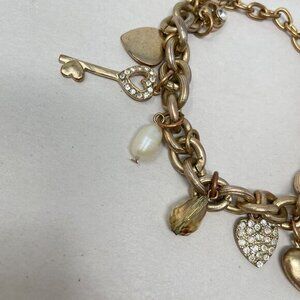 Elegant bracelet adorned with heart and key charms, crystals, and pearls. Adds a touch of sophistication and style to any outfit.