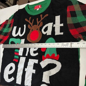 Design features a bold “What The Elf?” slogan with a reindeer face, red pom-pom nose, and colorful plaid sleeves. Perfect for ugly sweater parties, Christmas gatherings, or holiday photos.