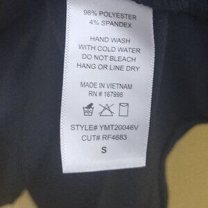 Polyester and spandex, measurements are 20" pit to pit and 25" length, ruffled cap sleeves, round neck, lightweight, roomy, relaxed hem, soft, cute, good condition and quality
