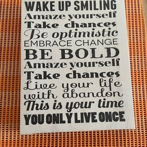 The ultimate daily reminder to Wake Up Smiling and be your best self every single day! The warm dark brown lettering in various fonts pop against the warm beige canvas. Hang this lightweight inspirational art where you can see it daily or place it on a shelf, desk or nightstand. The art work is 9 1/2” L x 7 1/2” W X 1 1/2” D.