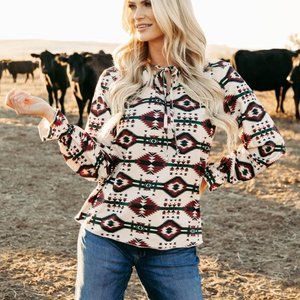 Take your style to a whole new level with this YOU SERIOUS CLARK TOP! This cream top will instantly give your wardrobe an elevated charm. The maroon and green aztec design is unique and modern, helping you make your own fashion statement. Get ready to turn heads!