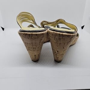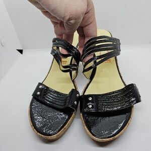 Black patent leather sandals with straps across the toes and the middle of the foot. Slide on style. In excellent used condition. Made in Italy. Wedge measures approximately 3.25", with a 1" platform under the ball of the foot.
