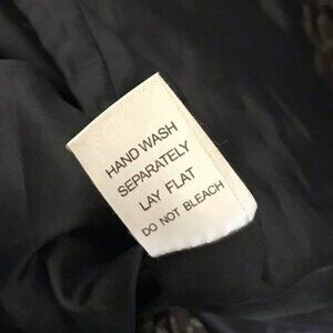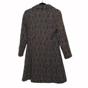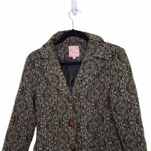 Brown and green pattern embroidered coat. Has button front closure and pockets. Has butterfly print on buttons. Preowned but in good condition.