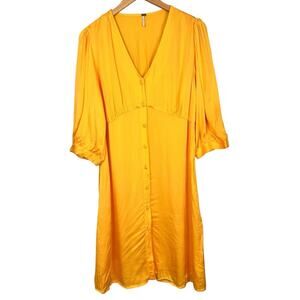 Bright yellow satin dress with a button-down front and V-neckline. Features three-quarter sleeves.
