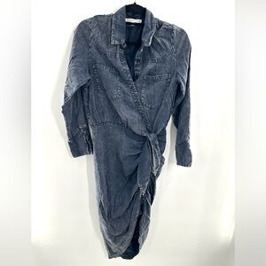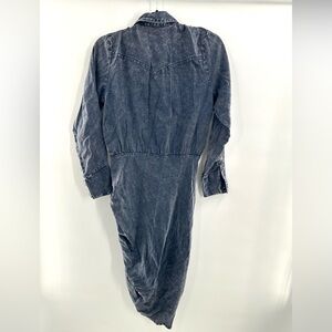 YFB Carling Western Shirt Dress, arched yoke western style top, tonal buttons for a seamless appearance, asymmetrical curved hem deeply ruched to crest with a ruffled effect, waisted middle has stationary ties, long sleeves, wide cuffs, 100% Tencel, deep denim wahsed blue/gray saturated dyed chambray.