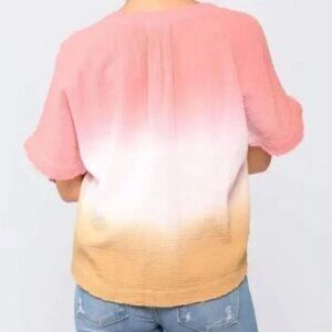 - Gauzy cotton shirt in an ombre style transitioning from a coral melon, to white, and then mustard yellow