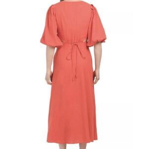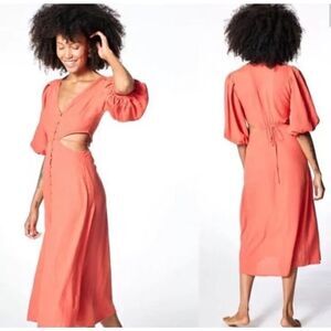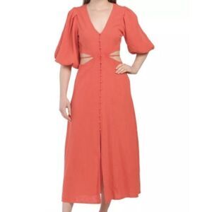 Turn heads in this striking red midi dress from Young Fabulous & Broke, crafted from a lightweight linen-rayon blend. Featuring side cutouts, a deep V-neckline, button front, and romantic puffed 3/4 sleeves, it’s the perfect piece for everything from brunch dates to beach vacations. Designed to flatter with a breezy silhouette and midi length.
