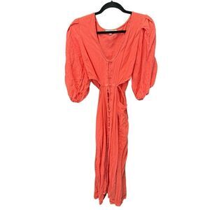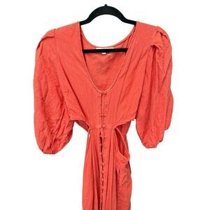 boho chic, summer dress, cutout dress, vacation outfit, resort wear, lightweight linen, beach dress, puff sleeves, button front, minimalist style, romantic look, breathable fabric, coral red