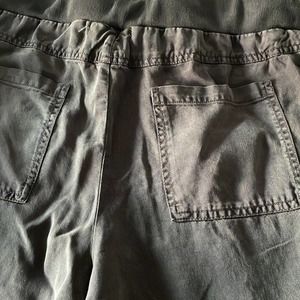 Elastic 2 inch waist band with a tie , 2 front pockets (1 slip pocket and other one zipper pocket) and 2 back pockets, cuff elastic hem