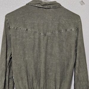 jumpsuit green washed like color see pics last photo is stock photo measurements approximately flat lay pit to pit 18 1/2 waist 15 front rise 10 inseam 2