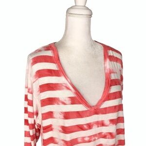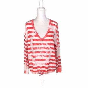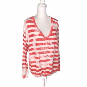 Pinky-red striped Young, Fabulous, & Broke tie-dye tunic top. V-neck, long sleeves, drawstring waist. Poly/rayon/spandex knit front and sleeves, 100% lightweight viscose semi-sheer back panel. Great used condition: no stains or holes; some minor pilling, shown up close in photos.