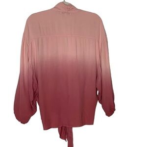 This gorgeous two tone blouse is perfect for summer or spring wear. Deep V neckline with tie. 100% rayon material. Elastic cuff. Pink and rose colored tones.