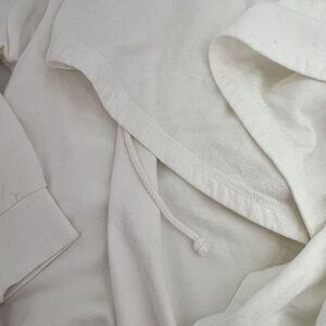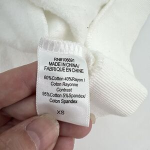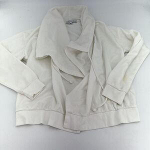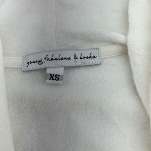 This is a pre-owned Young Fabulous & Broke cardigan in size XS. It is a solid white color with an open front and drawstring closure. The cardigan is made of a blend of rayon and cotton materials. It falls under the women's clothing category and is a regular size. The style is a cardigan with long sleeves and features an open front design.