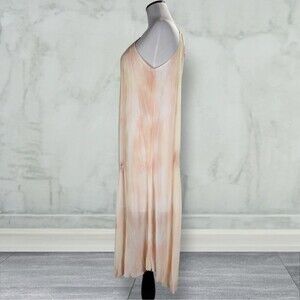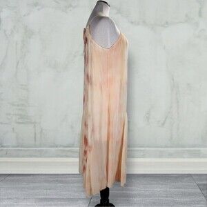 Pullover asymmetrical hem dress features a tent silhouette, halter neckline with adjustable drawstring, tie-dye print in a chiffon outer layer.