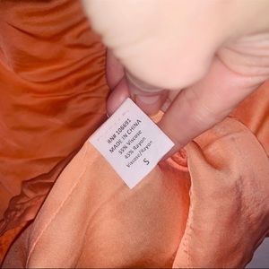 Amazing satiny bright peach short bubble sleeve blouse with wide elastic cuffs, full ruched button closure to front, v-neck, fitted style