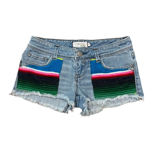 These stylish jean shorts feature a vibrant serape statement pockets, perfect for adding a pop of color to your casual wardrobe. The frayed hem adds a trendy touch, making them ideal for relaxed outings. Enjoy the comfort and style of these versatile shorts.