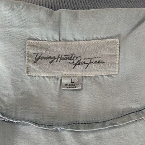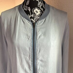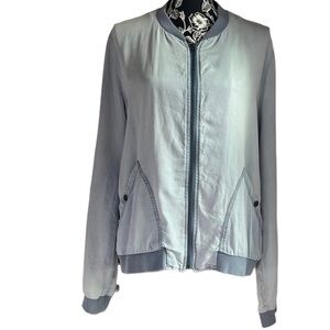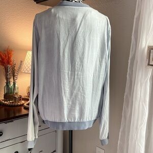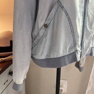 This is very light and more like a long sleeve shirt. Faded denim with a zipper, rounded collar, pockets, and wide band around the waist and rest. This is bomber jacket style in a shirt version. Great for layering!