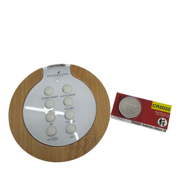 Pre-owned Young Living Aria ultrasonic diffuser remote control in good cosmetic condition with light surface wear and a few small scuffs on the wood finish, as shown. Remote has been tested and is fully functional. Includes one new CR2032 3V coin cell battery for immediate use. Original diffuser, box, and paperwork are not included. Designed as a replacement remote for the maple-wood Aria diffuser—please verify compatibility with your unit before purchase.