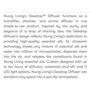 Brand new in box! The Young Living Dewdrop Diffuser functions as a humidifier, atomizer, and aroma diffuser in one easy-to-use product. Sleek and modern design blends with any home decor. Features ambient light settings and continuous or intermittent run modes. Ideal for use with essential oils.