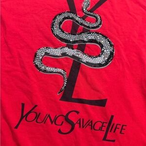 🔑 Keywords: Young Savage Life shirt, YSL snake tee, rhinestone graphic tee, hip-hop streetwear, red designer style top, men’s XL shirt, rap merch tee