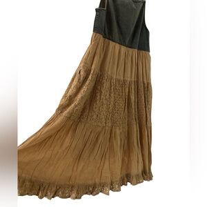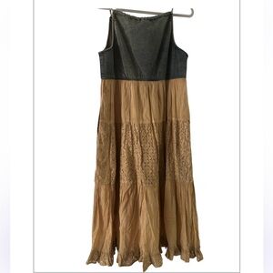 Western Vintage Vibe Midi Dress! Stretchy Embroidered Jean Bodice with a tiered Ruffle and lace bottom. Lined and has pockets! Adjustable Strap!