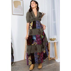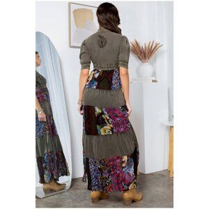 Wanderer’s Memory. She wears the road behind her. This short-sleeve patchwork dress is a map of moments—floral whispers, paisley echoes, and embroidered truths stitched into every tier. Olive green shoulders ground the piece, while the skirt blooms in earthy tones and wild recollections.