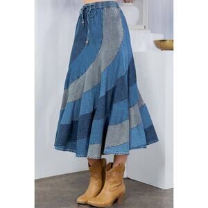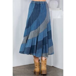 Experience the free-spirited charm of our Boho Fall collection with this captivating mid-length skirt. Designed to make a statement, this skirt features asymmetrical denim bias panels that add a touch of bohemian elegance to your outfit. Crafted with meticulous attention to detail, the skirt is made from mix and match of different colors washed denim . The asymmetrical bias panels are not only visually captivating but also serve to enhance the silhouette. The bias cut provides a clingy feel, gracefully hugging your body and creating a flattering shape that accentuates your curves. For your comfort and convenience, the skirt features an elasticated waistband with drawstrings. This allows for a customized and secure fit, ensuring that the skirt sits perfectly on your waist. This Fall Clothing mid-length skirt is a versatile piece that can be dressed up or down for various occasions. Disclaimer: Patches will vary between pieces, creating a unique look.