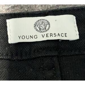 The product is a pair of Young Versace black straight leg jeans in size 27 with a 26.5 inch inseam. These women's jeans are from the renowned brand Versace, known for their high-quality and stylish clothing. The black color and straight leg style offer a sleek and sophisticated look, perfect for everyday wear or dressed up for a special occasion. Made with durable materials, these jeans are a versatile addition to any woman's wardrobe.
