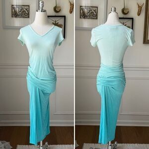 Young Fabulous & Broke Blue Ombré Midi Dress. Ruched sides, draping across the waist and hips, Vneck and super stretchy. Unlined. Short sleeve. Approximately 44 inches shoulder to hem. $150 retail.