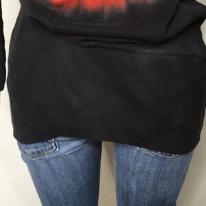 This fits my mannequin that is mostly a size 4. It has curvy hips and the bottom of the band is a little snug on it. Looks like it would fit a 2-slim 4 perfectly. I love this beautiful sweatshirt dress. It could be worn with jeans or as a dress! It is a tie-dye and there are variations in the color of the black as well as the orange.