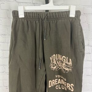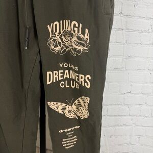 Embrace a blend of comfort and style with YoungLA's brown sweatpants, featuring a relaxed fit and elastic cuffs for a snug feel. The standout graphic print on one leg adds a unique touch, making these joggers perfect for casual outings. Crafted from soft material, they promise all-day comfort. Smoke free home.
