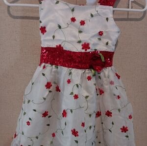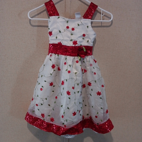 Charming dress featuring red floral patterns and sequins on a white background. Perfect for special occasions.